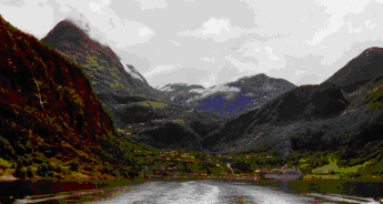 Wir verzichten heute auf das obligatorische Mittagessen aus der küchentechnischen Abteilung und werfen uns unter Mißachtung sämtlicher ökonomischen Grundregeln einen Hamburger ein. Danach gibt es am Anleger einen Kaffee und Raimund erklärt mir wo man den Dalsnibba sehen kann - wenn es nicht regnet. Daß man einen Flugzeugblick von dort oben hätte und daß der Fjord zum anfassen nahe wäre und ... es hat aufgehört zu regnen. Wir auf die Böcke und in die Berge.