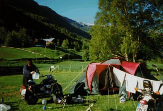 | Die Nacht war mit 3,9°C zu kalt für meinen Schlafsack und ich wärme mich am Morgen mit Duschmarken im Wert von locker DM15,-, in den hervorragenden sanitären Anlagen des Trollveggen-Camping, auf. Das Frühstück wird im Gemeinschaftsraum des Campingplatzes eingenommen, das Zelt im Regen abgebaut. Die Innenzelte komfortabel unter der Außenhaut, die Außenhaut in voller Regenbekleidung mit Helm. Gegen das Durchnässen der Handschuhe organisiere ich noch vier Plastiktüten, da wir uns entschlossen haben, uns lieber zum Horst zu machen, als alle 10 km die durchnäßten Sommerhandschuhe auf den Motorblöcken trocknen zu lassen.